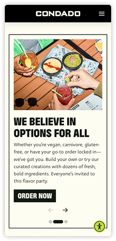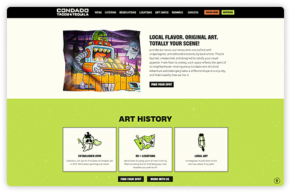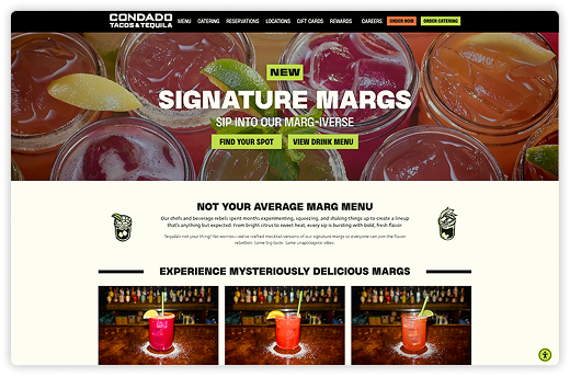 I led the redesign and ongoing management of the Condado Tacos website, maintaining the site while identifying pain points and designing solutions that improve the guest experience. I keep much of the work in-house using HTML and CSS, while also owning the stream of vendor-managed location pages and improving the flow-like ordering to make the site more intuitive and effective.