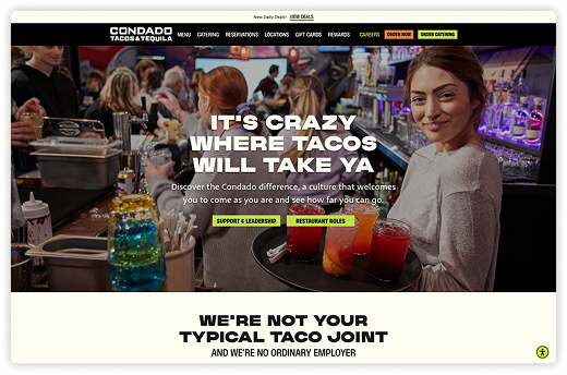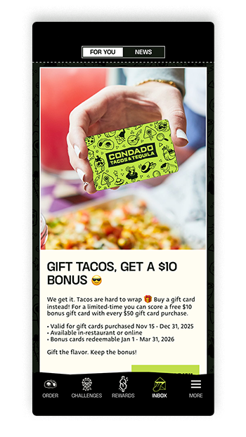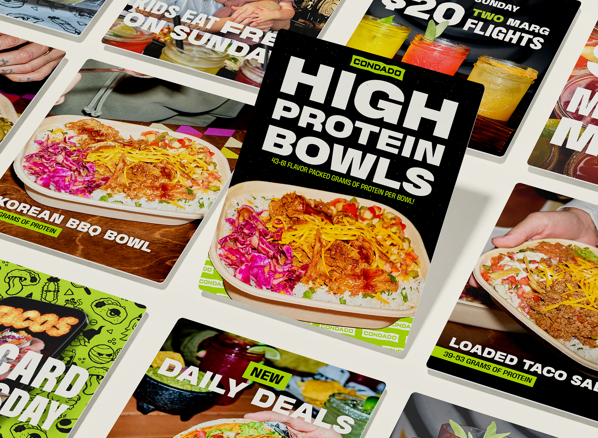 At Condado Tacos, I help shape the brand’s visual identity across web, app, motion, print, and in-store marketing. My work includes leading the ongoing development of Condado’s website and mobile app UX/UI, playing a key role in the company-wide rebrand, and introducing animation as a new creative capability to boost guest engagement. Across every touchpoint, I focus on creating clear, flexible design solutions that scale with the brand.