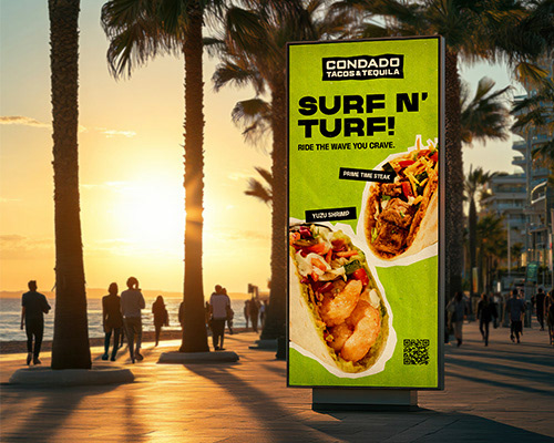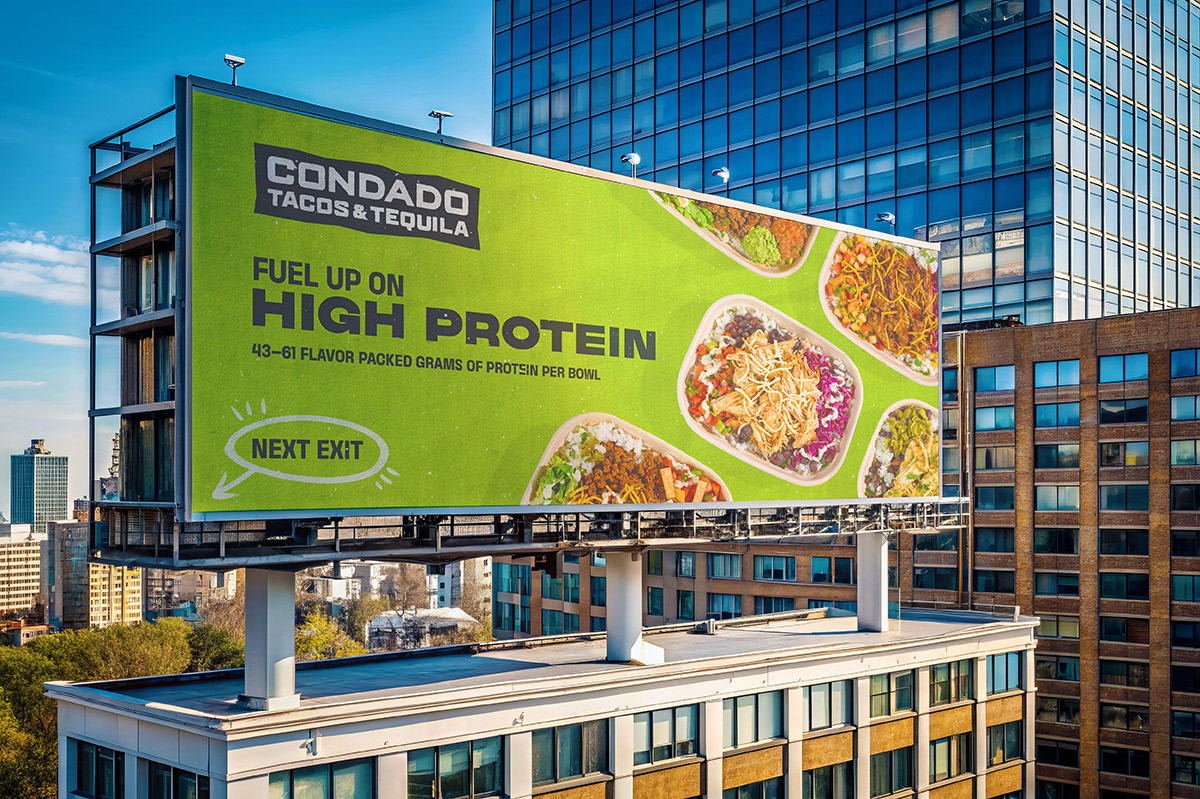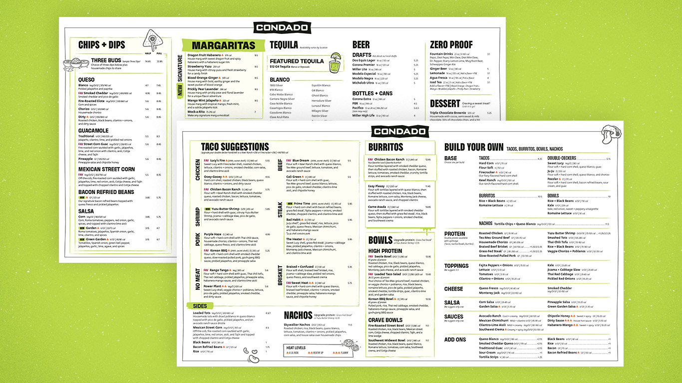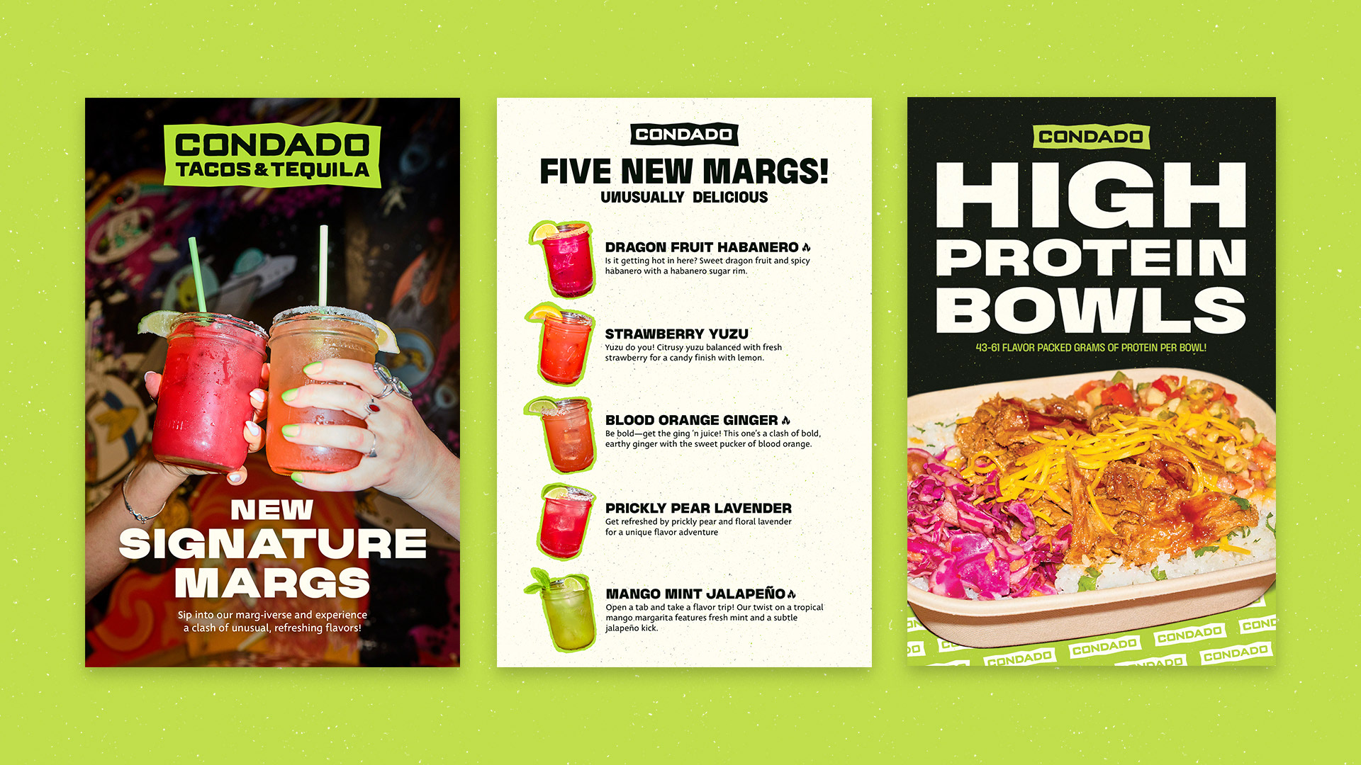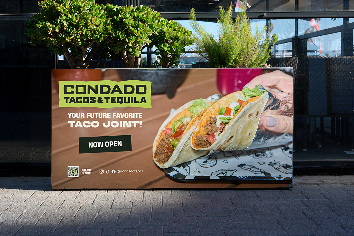 From menu design to exterior signage, a unique customer experience, scalable brand assets, and energetic design is at the forefront of the physical marketing space for Condado Tacos